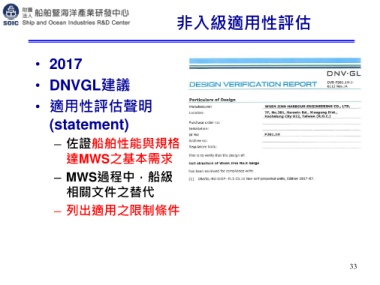 非入級適用性評估 • 2017 • DNVGL建議 • 適用性評估聲明 (statement) – 佐證船舶性能與規格 達MWS之基本需求 – MWS過程中,船級 相關文件之替代 – 列出適用之限制條件 33