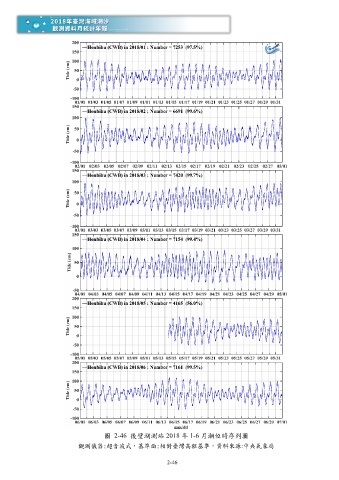 圖 2-46 後壁湖測站 2018 年 1-6 月潮位時序列圖 觀測儀器:超音波式,基準面:相對臺灣高程基準,資料來源:中央氣象局 2-46