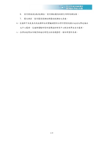 6. 當月最高(低)高(低)潮位:當月潮位最高的發生時間及潮位值。 7. 最大潮差:當月最高高潮位與最低低潮位之差值。 七、交通部中央氣象局及經濟部水利署觀測資料品管作業委託國立成功大學近海水 文中心處理。交通部運輸研究所港灣技術研究中心則由該單位自行處理。 八、各單位使用本年報資料進行研究分析及規劃時,請註明資料來源。 1-35