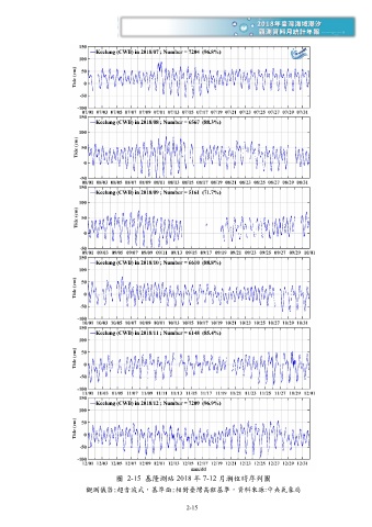 圖 2-15 基隆測站 2018 年 7-12 月潮位時序列圖 觀測儀器:超音波式,基準面:相對臺灣高程基準,資料來源:中央氣象局 2-15