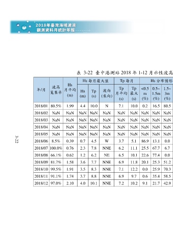 表 3-22 臺中港測站 2018 年 1-12 月示性波高(Hs)、尖峰週期(Tp)與波向重要統計量統計表