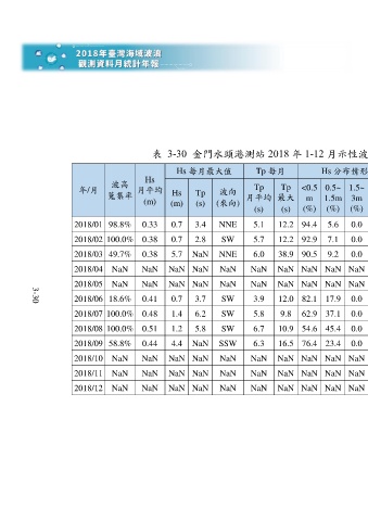 表 3-30 金門水頭港測站 2018 年 1-12 月示性波高(Hs)、尖峰週期(Tp)與波向重要統計量統計表