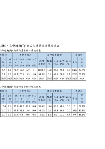 表 4-48 金門海域 2018 年 5-6 月海域示性波高(Hs)、尖峰週期(Tp)與波向重要統計量統計表