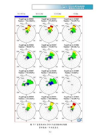 0.1-0.5 m 0.5-1.5m 1.5-3.0m >3.0m 圖 5-3 富貴角測站 2018 年波浪觀測玫瑰圖 資料來源:中央氣象局 5-3