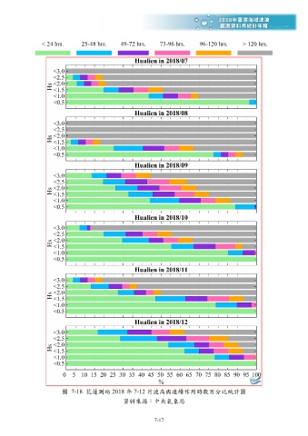 < 24 hrs. 25-48 hrs. 49- 72 hrs. 73-96 hrs. 96 -120 hrs. > 120 hrs. 圖 7-18 花蓮測站 2018 年 7-12 月波高與連續作用時數百分比統計圖 資料來源:中央氣象局 7-17