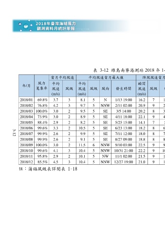 表 3-12 綠島南寮港測站 2018 年 1-12 月風速與風向重要統計量統計表