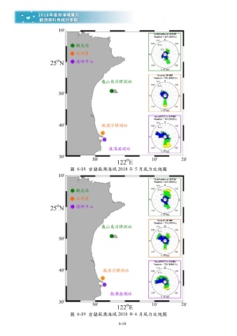 觀光局 水利署 港研中心 龜山島浮標測站 蘇澳浮標測站 蘇澳港測站 圖 6-18 宜蘭蘇澳海域 2018 年 5 月風力玫瑰圖 觀光局 水利署 港研中心 龜山島浮標測站 蘇澳浮標測站 蘇澳港測站 圖 6-19 宜蘭蘇澳海域 2018 年 6 月風力玫瑰圖 6-10