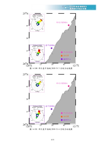 新竹浮標測站 臺中港測站 中央氣象局 水利署 港研中心 圖 6-100 新竹臺中海域 2018 年 3 月風力玫瑰圖 新竹浮標測站 臺中港測站 中央氣象局 水利署 港研中心 圖 6-101 新竹臺中海域 2018 年 4 月風力玫瑰圖 6-51