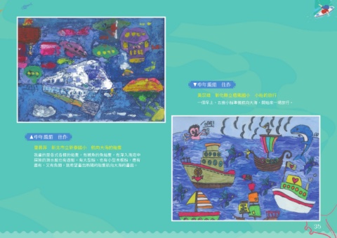 ▼中年級組 佳作 黃苡晴 彰化縣立梧鳳國小 小船的旅行 一個早上,五艘小船準備航向大海,開始來一場旅行。 中年級組 佳作 ▼ 曾晨菲 新北市立新泰國小 航向大海的船隻 我畫的是各式各樣的船隻,有捕魚的魚船隻,有深入海底中 探險的潛水艇也有遊艇。有大型船、也有小型木板船,應有 盡有,又有魚類,我希望畫出熱鬧的船隻航向大海的畫面。 35 ɨʹ ʫࠫ JOEE ʫࠫ JOEE ɨʹ