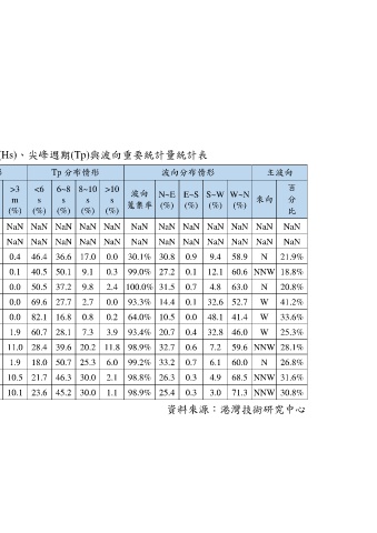 表 3-2 臺北港測站 2019 年 1-12 月示性波高(Hs)、尖峰週期(Tp)與波向重要統計量統計表