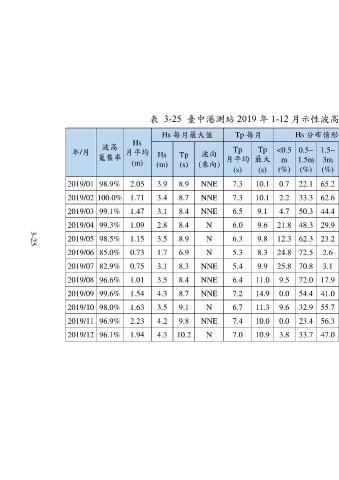 表 3-25 臺中港測站 2019 年 1-12 月示性波高(Hs)、尖峰週期(Tp)與波向重要統計量統計表