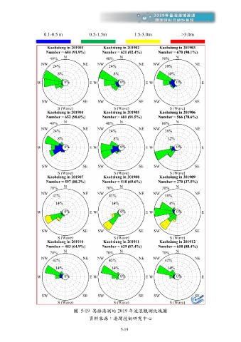 0.1-0.5 m 0.5-1.5m 1.5-3.0m >3.0m 圖 5-19 高雄港測站 2019 年波浪觀測玫瑰圖 資料來源:港灣技術研究中心 5-19