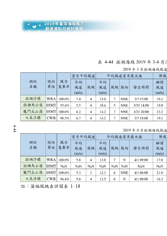 表 4-44 澎湖海域 2019 年 3-4 月海域風速與風向重要統計量統計表