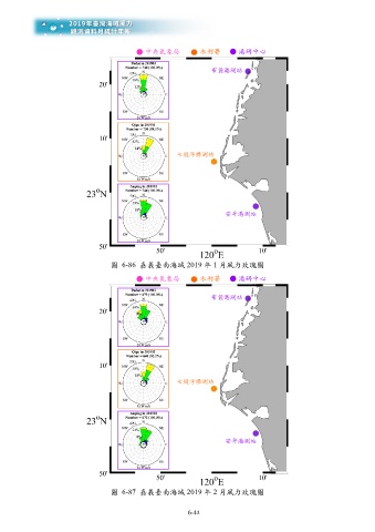 中央氣象局 水利署 港研中心 布袋港測站 七股浮標測站 安平港測站 圖 6-86 嘉義臺南海域 2019 年 1 月風力玫瑰圖 中央氣象局 水利署 港研中心 布袋港測站 七股浮標測站 安平港測站 圖 6-87 嘉義臺南海域 2019 年 2 月風力玫瑰圖 6-44
