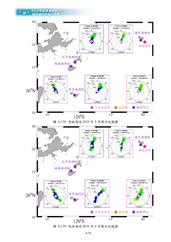 東引港測站 馬祖測站 北竿港測站 福澳港測站 東莒港測站 中央氣象局 水利署 港研中心 圖 6-138 馬祖海域 2019 年 5 月風力玫瑰圖 東引港測站 馬祖測站 北竿港測站 福澳港測站 東莒港測站 中央氣象局 水利署 港研中心 圖 6-139 馬祖海域 2019 年 6 月風力玫瑰圖 6-70